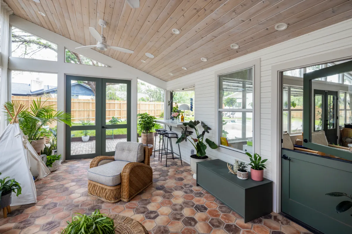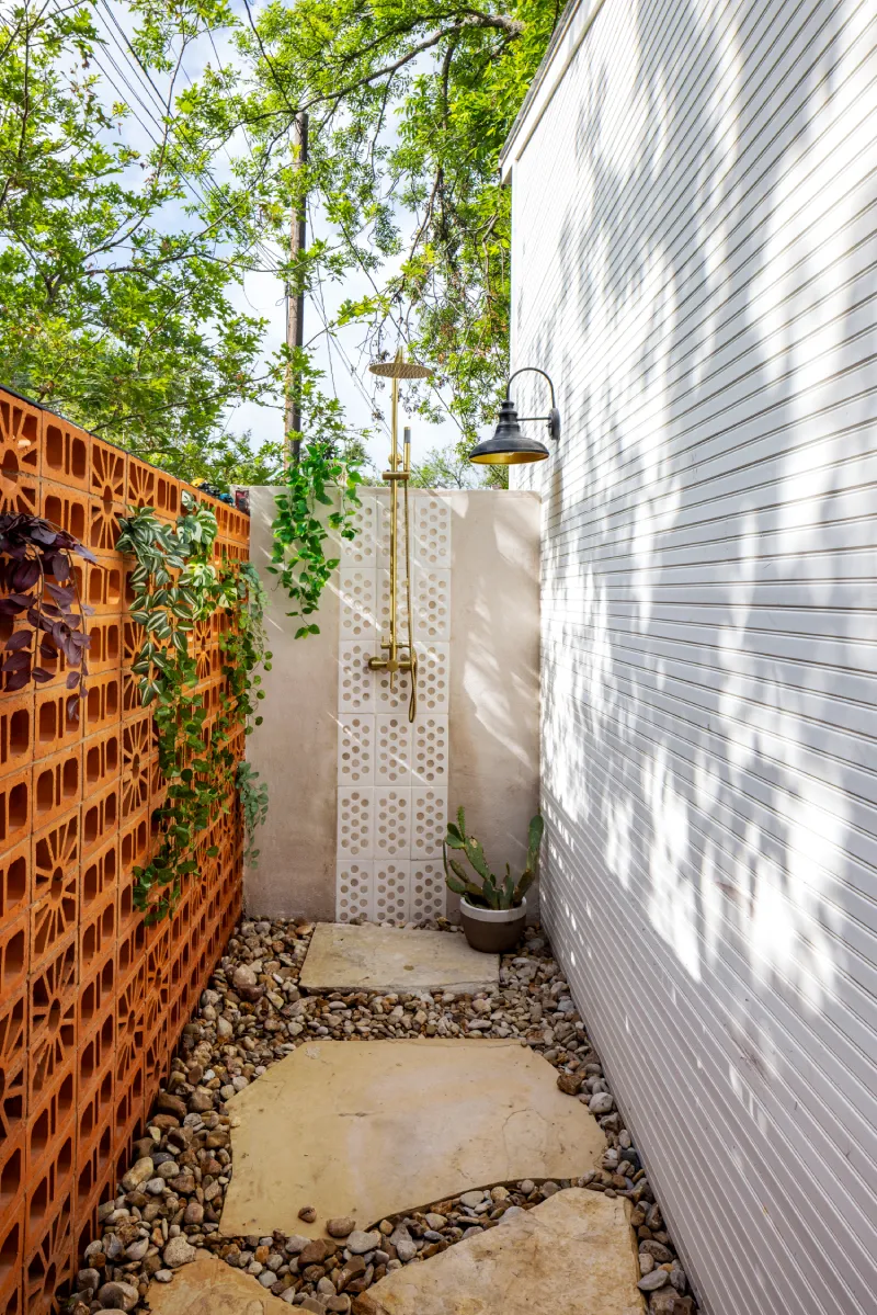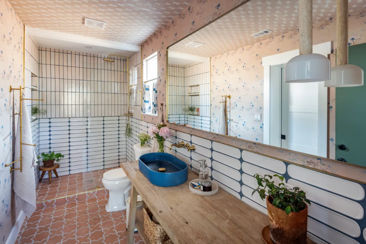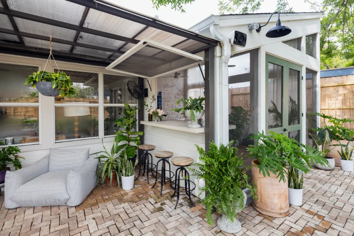 Highlights include a breezy screened porch with a pass-through bar and dual-access bathroom, plus an outdoor kitchen so integrated it feels like part of the home. Beyond the pool, a flexible accessory structure serves as guest quarters, event space, or a relaxed summer hangout complete with a full kitchen, a playful pink toilet, and an outdoor shower wrapped in plants.