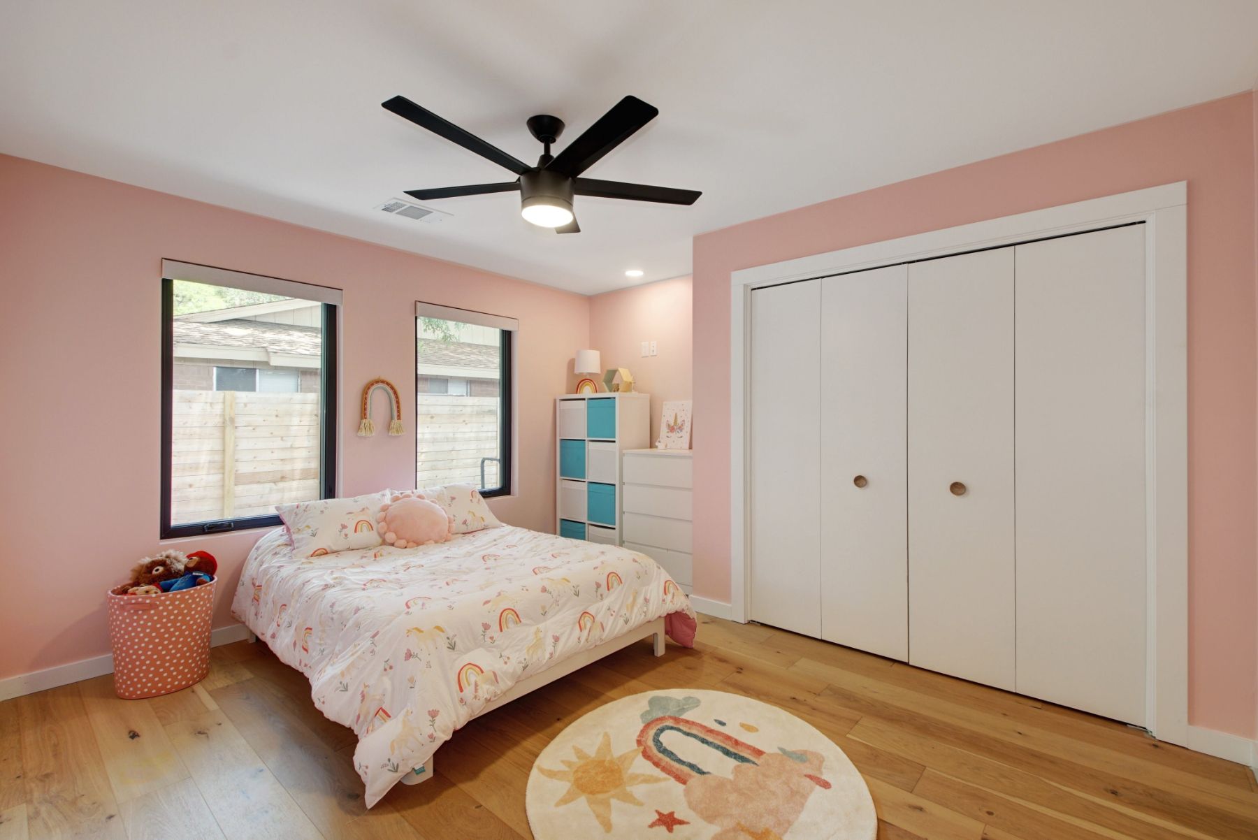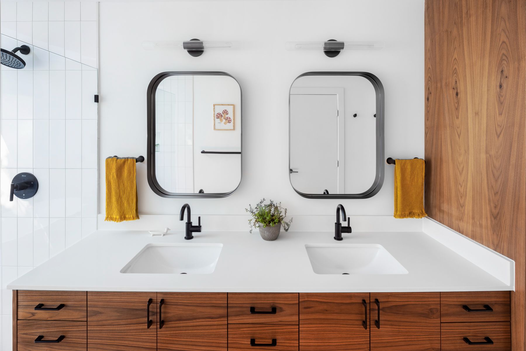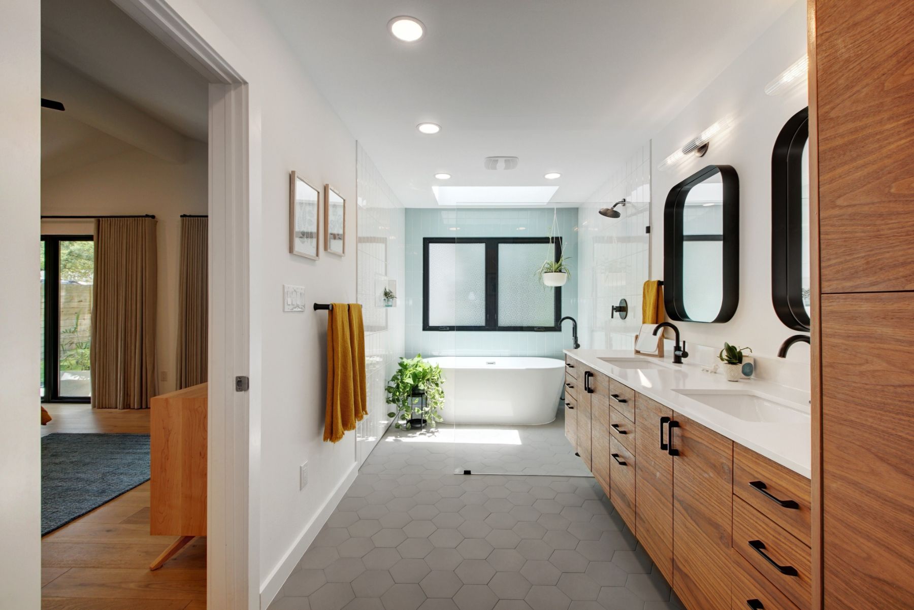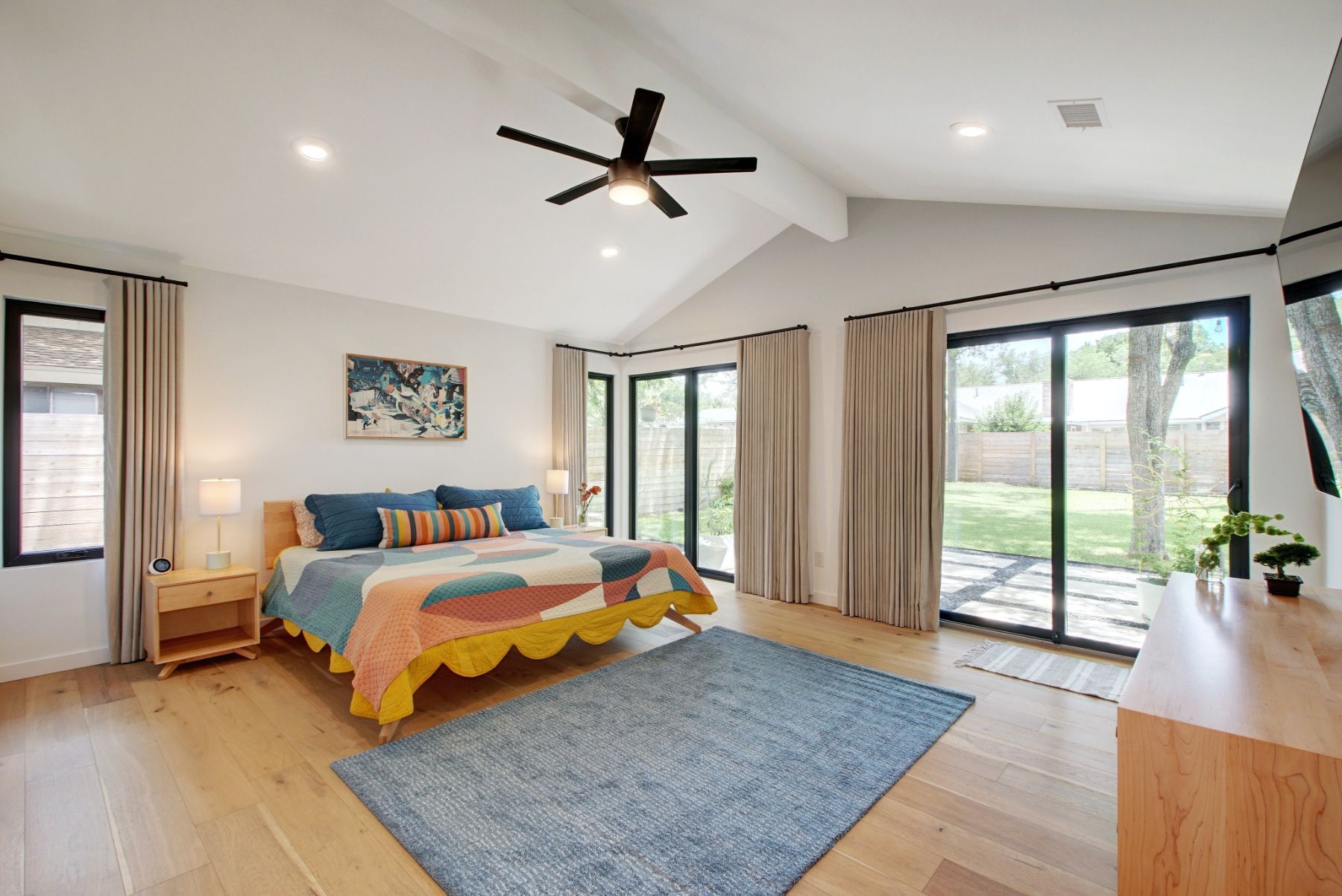 Inside the primary suite, space was carefully reallocated. A small bedroom was folded into the layout to allow for a larger bedroom and an all-new closet. The original closet and bathroom were merged into a spacious retreat, complete with a curbless wet room and abundant natural light. Secondary bedrooms were subtly reshaped, their layouts refined and windows expanded to invite more daylight in.