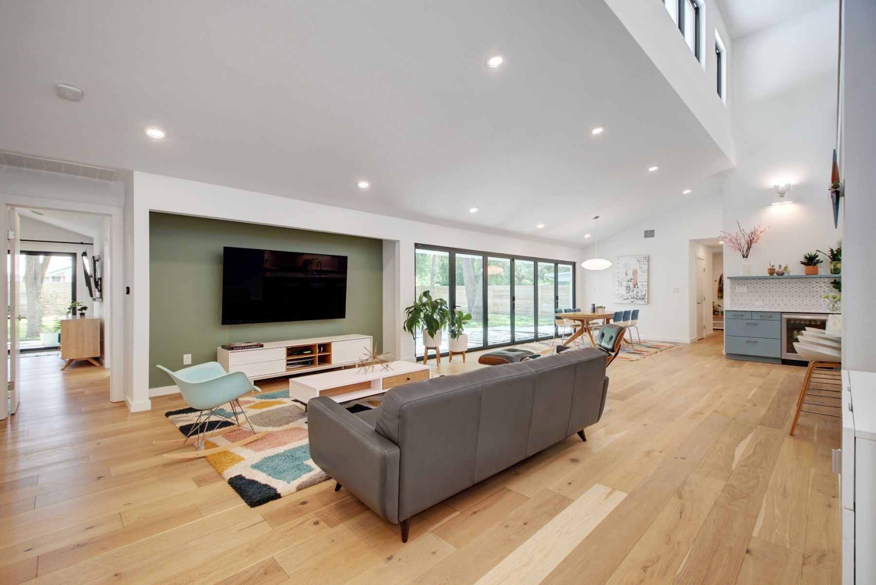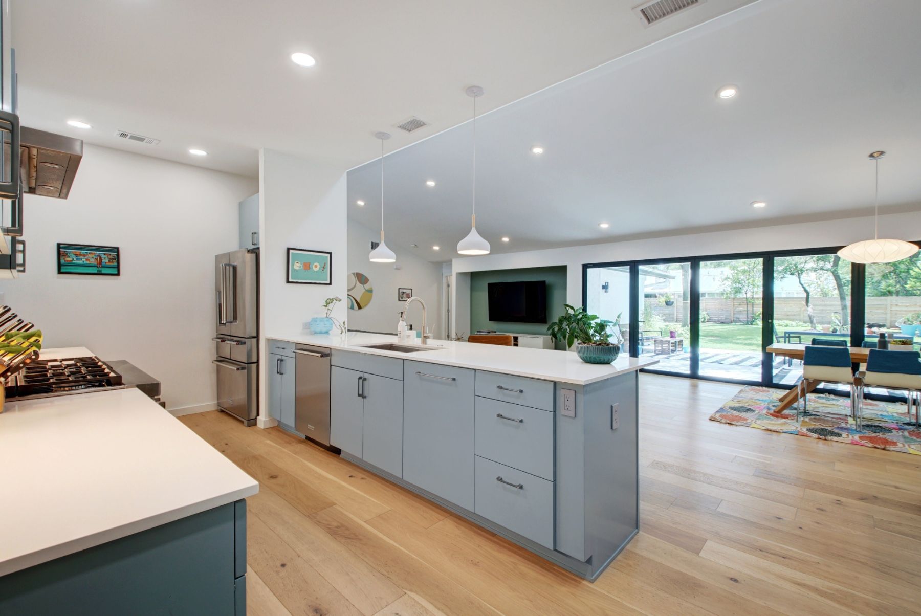 The former formal living and dining areas became a bright, modern heart of the home: a kitchen overlooking the backyard, anchored by a 20-foot panoramic door.