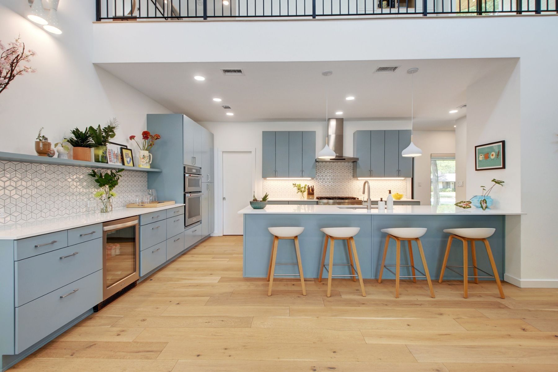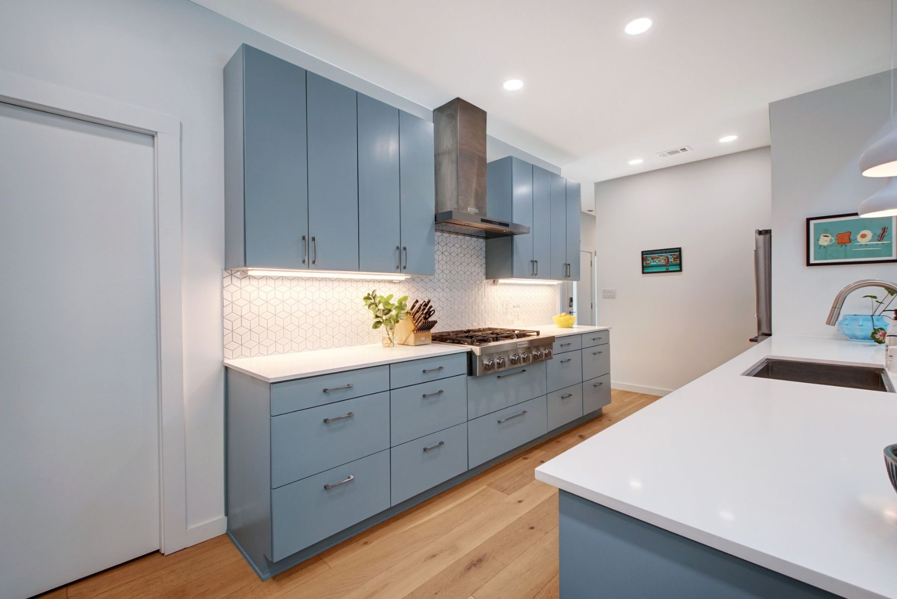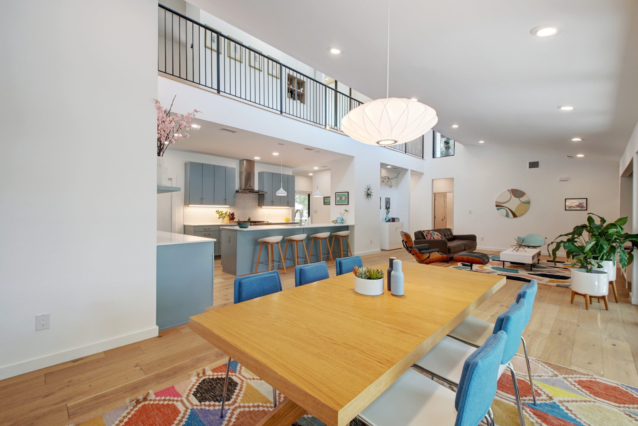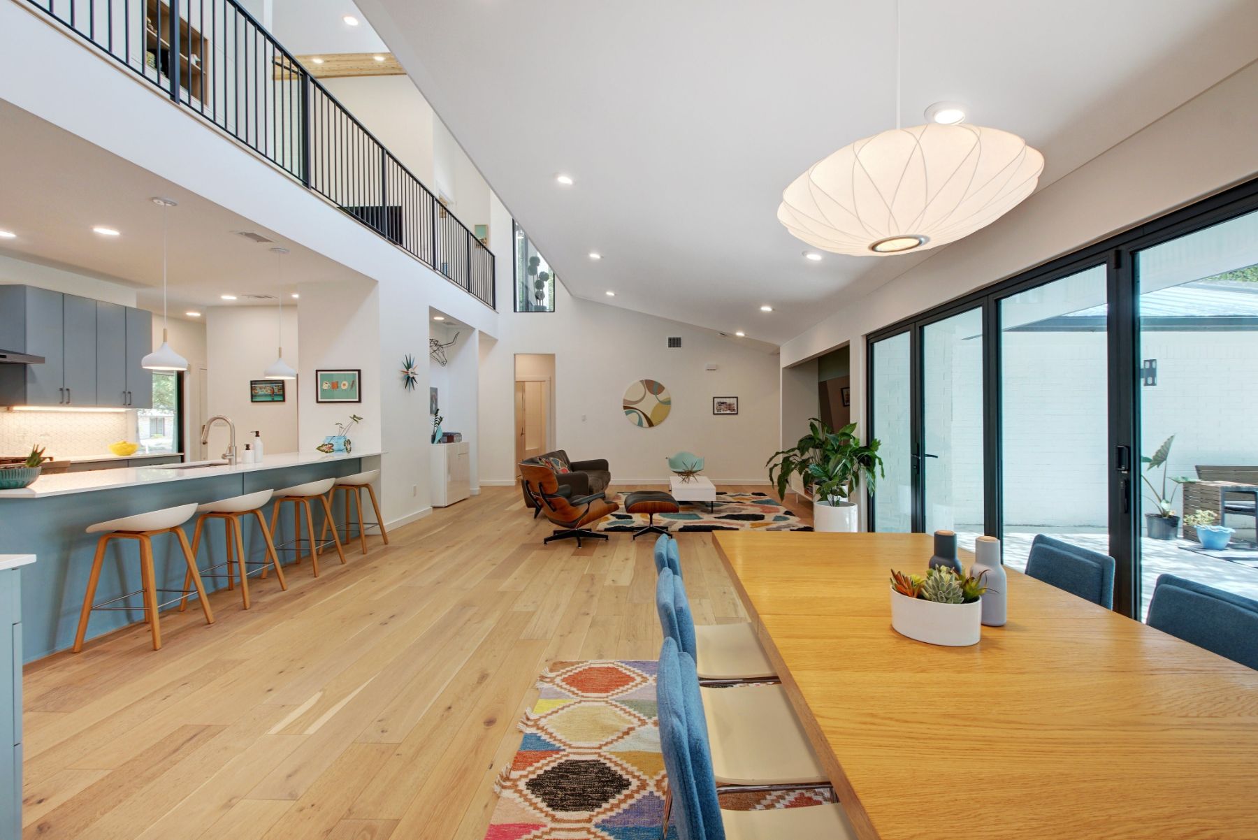 so we focused on reconfiguring walls within the existing footprint and adding a second story. The formal living and dining areas became the staircase and a kitchen looking out to the backyard, framed by a 20’ panoramic door.